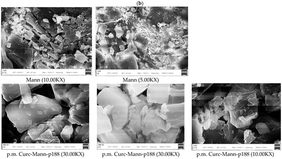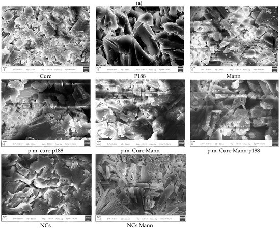 Figure 5. (a). Scanning Electron Microscopy of different samples (X5000). Details of named samples: curcumin (Curc); mannitol (Mann); poloxamer 188 (P188); physical mix curcumin and poloxamer 188 (p.m. Curc-P188); physical mix curcumin, mannitol and poloxamer 188 (p.m. Curc-Mann-P188); physical mix curcumin and mannitol (p.m. Curc-Mann); nanocrystals (NCs); nanocrystals with mannitol (NCs Mann); (b). Pictures showed images related to more magnification and different sample areas for Mann and p.m. Curc-Mann-P188.