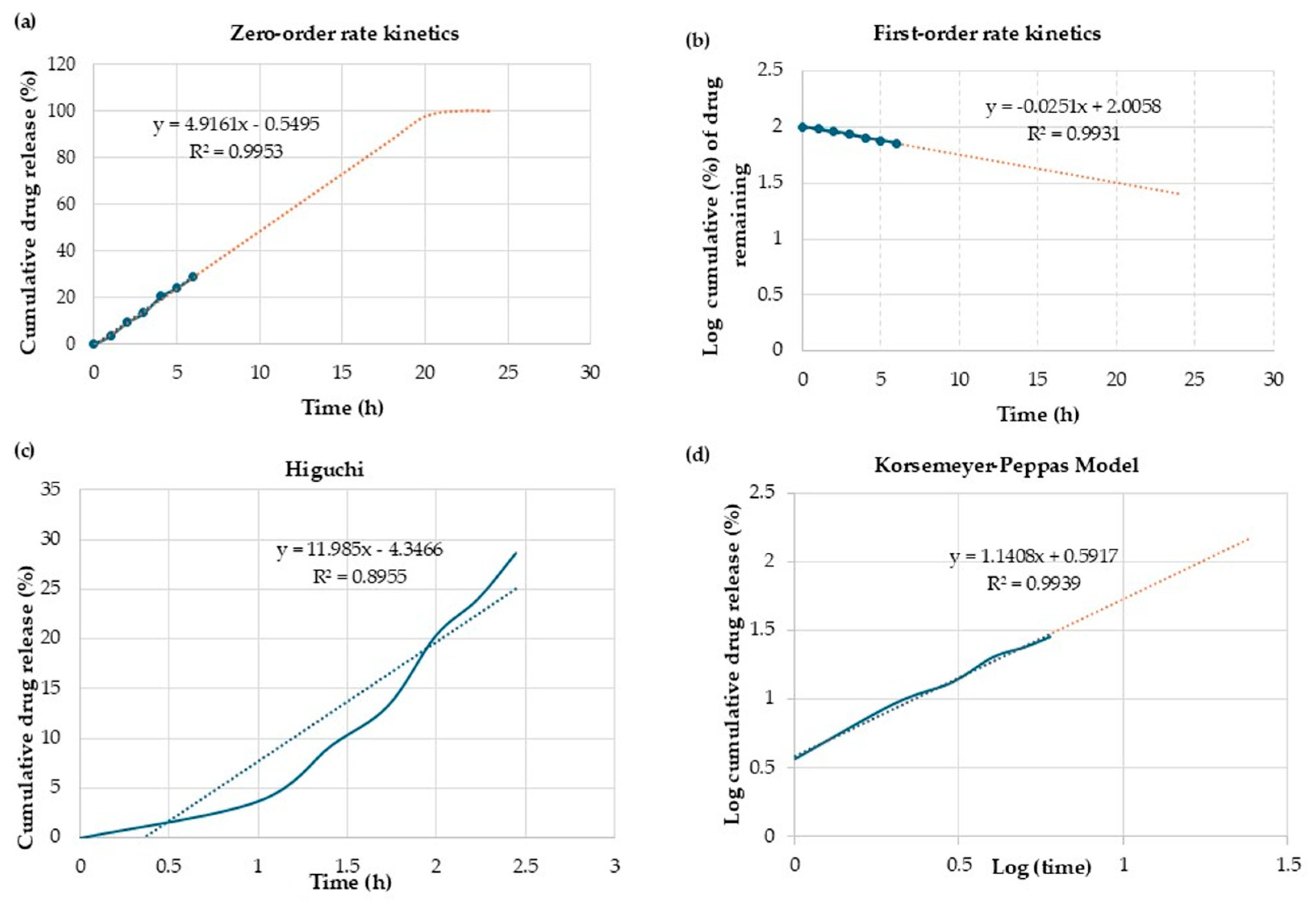 | Sample | Zero-Order | First-Order | Higuchi | Korsmeyer Peppas | |
