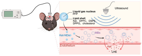 For Ket-ND preparation, 1,2-dipalmitoyl-sn-glycero-3-phosphatidylcholine (DPPC, Cat#: LP-R4-057, ≥99.0%, Molecular Weight (MW): 733 g/mol), 1,2-distearoyl-sn-glycero-3-phosphoethanolamine (DSPE, Cat#: LP-R4-020, ≥99.0%, MW: 748 g/mol), 1,2-dipalmitoyl-sn-glycero-3-phospho-(1′-rac-glycerol) (DPPG, Cat#: LP-R4-016, ≥99.0%, MW: 744 g/mol), and cholesterol (Cat#: R-H-100001, ≥99.0%, MW: 386.65 g/mol) were purchased from Xi’an Ruixi Biotechnology Co., Ltd. (Xi’an, China). Chloroform (CAS: 67-66-3, ≥99.0%, stabilizer: 0.3–1.0% ethanol, MW: 119.38 g/mol) was purchased from Sichuan Xilong Science Co., Ltd. (Chengdu, China). Perfluoropentane (PFP, CAS: 678-26-2, Cat#: STREM-09-6182, ≥98.0%, MW: 288.03 g/mol) was purchased from Strem Chemicals, Inc. (Newburyport, MA, USA). Ketamine hydrochloride (CAS: 1867-66-9, 99.8% purity by HPLC, MW: 274.19 g/mol) was purchased from Shanghai Yuansi Standard Technology Co., Ltd. (Shanghai, China). Phosphate buffered saline (PBS) was purchased from Servicebio Technology Co., Ltd. (Wuhan, China).