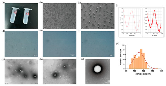 The prepared Ket-NDs appeared as a semi-transparent white suspension (Figure 4a). Cryo-SEM results demonstrated that Ket-NDs exhibited good dispersibility with spherical morphology and uniform size distribution (Figure 4b,c). Optical microscopy (200× magnification) revealed spherical Ket-NDs with homogeneous size distribution and no obvious aggregation (Figure 4d–f), showing a density of approximately 3.2 × 108 particles/mL. TEM imaging confirmed that Ket-NDs possessed a core–shell structure with regular spherical shape (Figure 4g–i).