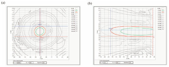 Contour map of axial cross-sectional sound pressure at the focal point of the collimator-equipped probe. (a) X-Y plane. (b) X-Z plane. The ultrasound emission direction is from Zmax to Zmin.