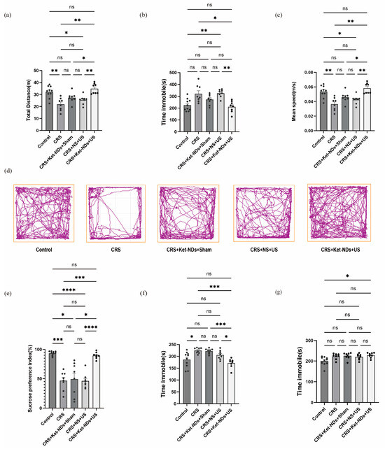 Statistical analysis using Brown–Forsythe ANOVA with Dunnett’s T3 post hoc tests revealed the following. During the 10 min OFT session, mice subjected to CRS exhibited significantly reduced total travel distance compared to control mice (Figure 8a; p < 0.01, Mean Diff. = +10.36 m, Control vs. CRS), indicating diminished exploratory behavior. This CRS-induced deficit was fully rescued by Ket-NDs + US treatment (Figure 8a; p < 0.01, Mean Diff. = −13.01 m, CRS + Ket-NDs + US vs. CRS), demonstrating restoration of locomotor activity. One-way ANOVA revealed a marginal group effect on immobility time in CRS mice (p = 0.0696; Figure 8b). Although the increase in immobility time (Control vs. CRS) did not reach strict significance, Ket-NDs + US treatment significantly reversed this trend (Figure 8b; p < 0.05, CRS + Ket-NDs + US vs. CRS). Furthermore, CRS mice showed markedly decreased average movement speed (Figure 8c; p < 0.01, Control vs. CRS), which was normalized after Ket-NDs + US intervention (Figure 8c; p < 0.01, CRS + Ket-NDs + US vs. CRS). These results collectively indicate that Ket-NDs + US treatment effectively ameliorates CRS-induced locomotor and exploratory deficits, highlighting its potential as an antidepressant therapy.