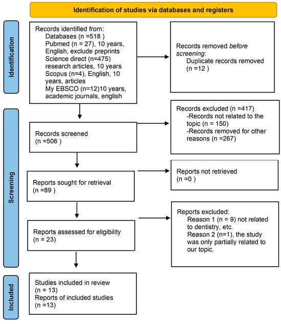 The authors independently identified the literature by searching the databases specified above as well as other sources. The process is detailed in the PRISMA flowchart, as shown in Figure 2, and the search was conducted as follows: Identification phase: 518 articles were extracted from the databases in total. Articles that were retrieved were exported to the Rayyan web application. After comparing the titles, 12 were removed for duplicate records, ending with 506 articles in this phase. Screening phase: The literature screening process was carried out by using the Rayyan qcri tool []. By screening the title and abstracts of the articles, 417 were excluded and then 89 were selected for retrieval. Then, after further screening of the full text of the articles, a total of 23 articles were selected. Eligibility phase: Out of 23 articles, the final 13 articles were included. The rest of the 10 articles were excluded because they were only partially related to the topic or not totally related to dentistry. Inclusion phase: 13 studies were included in the qualitative synthesis and reported in this review.
