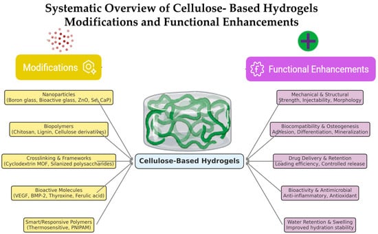 Modifications of cellulose-based hydrogels that enhance different types of functional properties (e.g., degradation, bioactivity, porosity), based on the included studies.