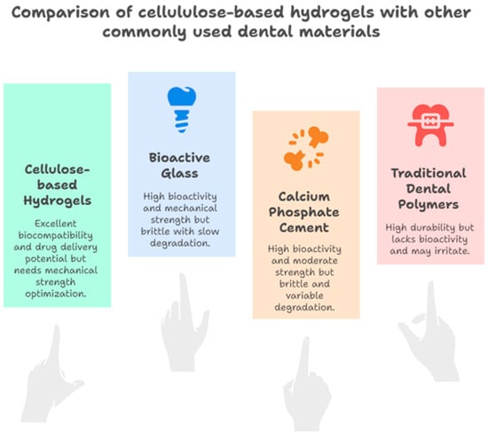Comparison of cellulose-based hydrogels with other commonly used dental materials, highlighting differences in biocompatibility, drug release, and regenerative potential.