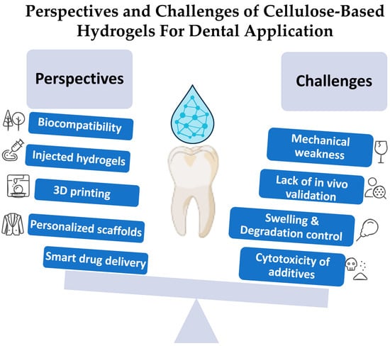 Conversely, progressive degeneration may impede integration with the surrounding tissue. The enhancement in both strength and regulated degradation can be achieved through the modulation of crosslinking density. An additional issue may pertain to achieving uniform dispersion of nanoparticles, as irregular distribution could influence the mechanical properties and biological responses. Moreover, the swelling behavior has to be under control since too large an expansion can affect the drug release kinetics and scaffold orientation. Changing the cellulose content and crosslinking density helps to improve the functional stability and control of swelling. Especially for crosslinking agents and additives, cytotoxicity presents a major obstacle. Adverse tissue reactions can be avoided by means of biodegradable, non-toxic substitutes only in their development. Moreover, it is important to emphasize that in vitro results need thorough confirmation in vivo since the oral environment, such as pH changes and enzymatic activity, can influence hydrogel efficacy. More research is needed on biological factors such as hydrogels made of cellulose’s breakdown behavior and long-term biocompatibility. Comprehensive in vivo studies and clinical trials are necessary to determine the safety and effectiveness of these materials in real-world settings, even though earlier studies have produced encouraging results. Furthermore, avoiding side effects and optimizing therapeutic results will require an understanding of how cellulose-based hydrogels interact with the human immune system []. Environmental impact and sustainability are also becoming significant considerations in the creation of hydrogels based on cellulose. Since cellulose comes from renewable resources, it provides a more environmentally friendly option to the synthetic polymers frequently seen in dental biomaterials. In order to further minimize these materials’ environmental impact while preserving their high performance and utility, future research should concentrate on refining extraction and processing techniques []. Although cellulose-based hydrogel research has advanced a lot, there are several limitations that exist and need to be addressed in the future. Some of the major limitations that are essential to overcome the current knowledge gaps are that most of the current research focuses mainly on in vitro investigations and focuses on cell types, which might not be able to predict or replicate the in vivo settings accurately. Regulations are closely watched when developing biomaterials for tissue engineering when obtaining approvals from regulatory bodies such as the FDA; therefore, before the materials are used clinically, they need to undergo rigorous in vivo testing. Additionally, as the current studies mainly focus on short-term in vitro effects, the long-term patient outcomes are very difficult to predict. Thus, it is crucial to understand the long-term mechanical stability, physiological biocompatibility, enhancing the drug delivery capacity using these scaffolds, and understanding and modifying the degradation behavior and rate of cellulose-based hydrogels. Addressing these limitations will help in developing multifunctional platforms for future advancements of these materials. Filling the full potential of cellulose-based hydrogels in regenerative dentistry will depend on addressing these limitations by biomaterial innovation and thorough clinical evaluation.