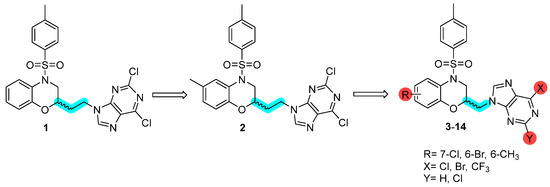 In an effort to find new and potent antiproliferative agents and to gain further insight into the mechanism of action by which such derivatives induce cell death, we have designed a new series of substituted benzoxazines. These derivatives have electron-withdrawing groups (3–10) and electron-donating groups (11–14) linked by a methyl to a substituted purine system (Figure 1). We have eliminated a rotatable bond in these compounds, a pharmacomodulation strategy known as truncation. This modification is expected to increase the stability and potency of the compounds by reducing conformational flexibility. In addition, the synthesis of these new derivatives (3–14) offers the advantage of a shorter synthetic route, making it a more efficient method.