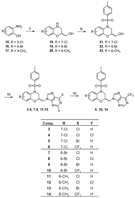 The synthetic procedure to obtain target compounds 3–14 is summarized in Figure 2. The one-pot reaction [25] of the substituted 2-aminophenols 15–17 with epichlorohydrin in an aqueous basic medium gave the benzoxazine derivatives 18–20 (i, Figure 2, 74–84% yield). Sulfonamides 21–23 were obtained by reacting with p-toluensulfonil chloride and pyridine (ii, Figure 2, 87–89% yield). Then, the Mitsunobu reaction was performed using triphenylphosphine (Ph3P), diisopropylazodicarboxylate (DIAD) and the appropriate purine in anhydrous tetrahydrofuran, resulting in the formation of derivatives 3–5, 7–9 and 11–13 (iii, Figure 2, 82–87% yield). Finally, the bromine on the purine heterocycle is replaced with a trifluoromethyl group, by reacting the 6-bromopurine derivatives 5, 9 or 13, with copper (I) iodide, methyl 2,2-difluoro-2-(fluorosulfonyl) acetate (MFSDA), and hexamethylphosphoramide (HMPA). This reaction was carried out using microwave irradiation at 150 °C for 5 min to give compounds 6, 10 and 14 (80–86% yield).
