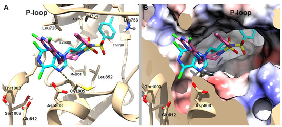 According to the predicted docking poses of (R)-12, the ligand points the benzoxazine toward the hinge region, where it is flanked by hydrophobic residues such as Leu726, Val734, Leu800, Met801, and Leu852 on both sides of the ring. The purine is positioned in a pocket at the entrance of the catalytic site formed by residues Ser1002, Thr1003, Asp808, and Glu812. It forms a hydrogen bond with the backbone of Cys805. The phenylsulfonamide is positioned deep within the catalytic site in a hydrophobic cleft formed by Ala751, Thr798, and the alkyl chain of Lys753. In contrast, (S)-12 partially aligns with its (R)-enantiomer, but it positions the purine and phenylsulfonamide moieties toward the solvent-exposed area in a U-shaped conformation, which removes the purine from the pocket at the entrance to the catalytic site (Figure 3). This atypical orientation of (S)-12 likely underlies its reduced binding affinity, as predicted by its less favorable AutoDock score (Table 3).