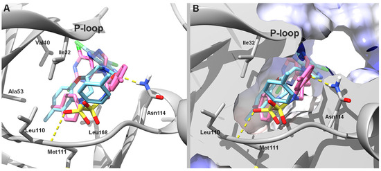 The molecular conformation of compound 12 was also studied on human mitogen-activated protein kinase 8 (hJNK1, PDB ID 4AWI) [28]. In comparison to the hHER2 crystal structure (PDB ID 3RCD), the hJNK1 structure (PDB ID 4AWI) exhibits a narrower ATP-binding site entrance and lacks the pocket located at the entrance of the catalytic site. Additionally, the hJNK1 crystal structure features a larger binding site pocket that can accommodate compound 12. Both enantiomers of 12 were docked into the ATP-binding site of the hJNK1 isoform (PDB ID: 4AWI). In the docking conformation, the purine moiety of each enantiomer is deeply inserted into the active-site cavity and adopts a mutually orthogonal orientation while residing in the sub-P-loop region. The sulfonamide functional group of both enantiomers is oriented deep into the catalytic site and toward the hinge region. A hydrogen bond is observed between the sulfonic oxygen atom of (S)-12 and the backbone chain of Met111.
