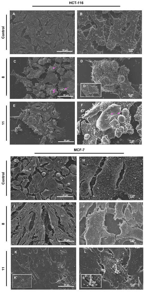 Cell morphology was evaluated via scanning electron microscopy (SEM). HCT-116 and MCF-7 cells were seeded onto sterile glass coverslips (13 mm diameter) in 24-well plates and cultured for 24 h before treatment. Cells were then incubated for 12 h with compounds 9 or 12 (50 μM). After treatment, cells were washed in cold PBS, fixed, and processed for SEM according to established protocols. Imaging was conducted using a Hitachi S-800 microscope (Hitachi, Tokyo, Japan).