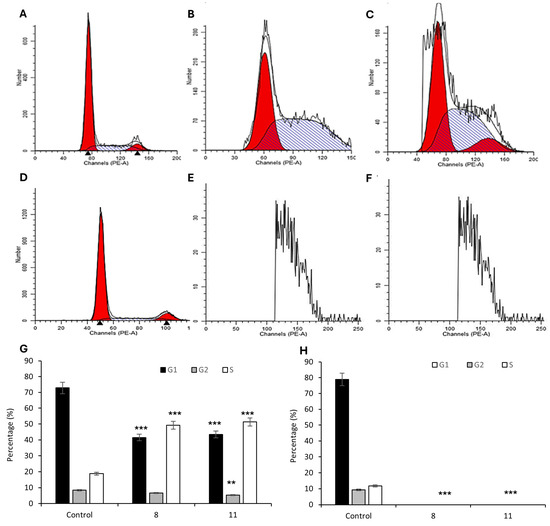 Cell cycle progression was evaluated by propidium iodide (PI) staining and flow cytometry. HCT-116 and MCF-7 cells were exposed to 50 μM of 9 or 12 for 12 h. Following treatment, cells were harvested, washed twice in PBS, and fixed with 70% cold ethanol at 4 °C for 30 min. After fixation, samples were incubated with PI/RNase staining buffer (BD Pharmingen™, Cat. No. 550825 according to the manufacturer’s instructions. DNA content analysis was carried out using a FACSCalibur flow cytometer (BD Biosciences, Franklin Lakes, NJ, USA), and the distribution of cells across the G0/G1, S, and G2/M phases was determined using standard analytical software.