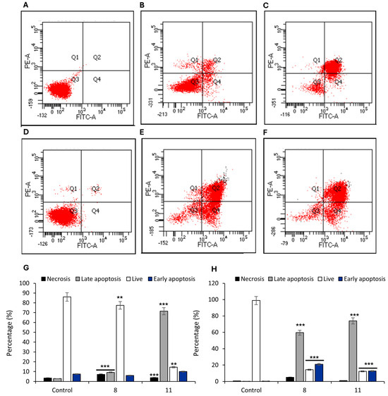 Apoptosis was assessed using a fluorometric Annexin V-FITC assay kit (eBioscience, San Diego, CA, USA). Cells were plated in 6-well plates and treated with 50 μM of either compound 9 or 12 for 12 h. Staining was carried out as per manufacturer’s instructions. Flow cytometry analysis was conducted immediately using a FACSAria III (BD Biosciences) at the Scientific Instrumentation Centre, University of Granada.