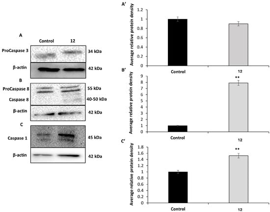 Western blot analysis of caspase activation (caspases-3, -8, and -1) as an initial approach to elucidate the regulated cell death mechanisms triggered by compound 12 in HCT-116 cells. Protein bands from (A) pro-caspase-3, (B) pro-caspase and caspase-8, (C) caspase-1. Relative quantification of proteins of (A’) pro-caspase-3, (B’) pro-caspase and caspase-8, (C’) caspase-1. Western Relative quantification of proteins normalized with β- actin signal and relative to control cells (value 1). Statistical significance: ** p < 0.01 vs. control.