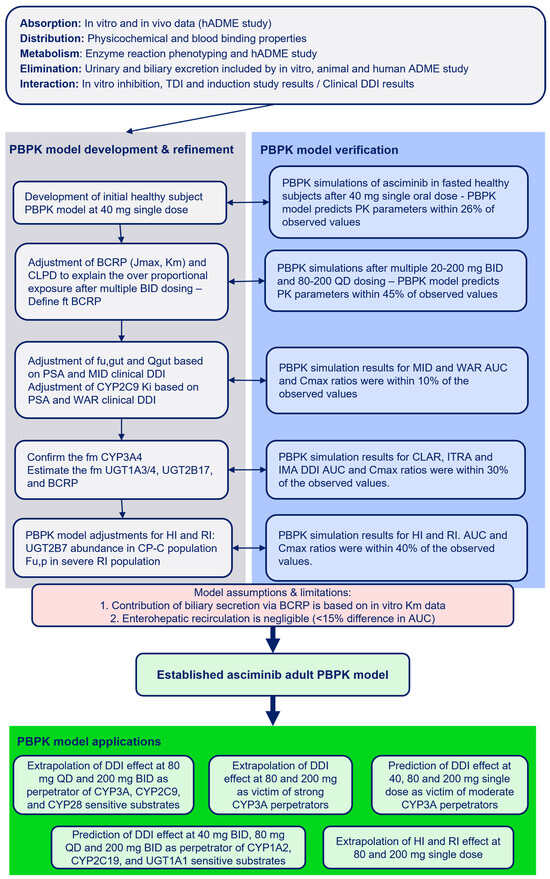 The input parameters and assumptions used in the development of the PBPK model for asciminib are summarized in Table 1. The overall process of PBPK model development, refinement, and performance verification is outlined in Figure 1.