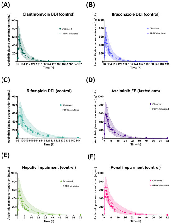 Using the established asciminib PBPK model, the victim and perpetrator DDIs as well as the effects of HI and RI were predicted at therapeutic asciminib doses of 80 mg QD and 200 mg BID. PBPK predictions for DDI scenarios that were not tested clinically at the 40 mg dose level are also provided. Precisely, the established asciminib model was applied to predict the DDI effects of strong CYP3A perpetrators (rifampicin, clarithromycin, and itraconazole) and imatinib on the PK of asciminib after oral administration of a single 80 or 200 mg dose. It was also applied to predict the DDI effects of moderate or weak CYP3A perpetrators (efavirenz, fluconazole, and erythromycin) on the PK of asciminib after oral administration of a single 40, 80, or 200 mg dose. Furthermore, it was applied to predict the steady-state effects of asciminib after multiple administrations of 80 mg QD or 200 mg BID on the PKs of sensitive CYP3A4 (midazolam), CYP2C9 (warfarin), and CYP2C8 (repaglinide) substrates as well as of 40 mg BID, 80 mg QD, and 200 mg BID on the PK of sensitive CYP2C19 (omeprazole) and UGT1A1 (raltegravir) substrates. Lastly, the model was applied to extrapolate the effects of mild, moderate, and severe HIs or RIs on the PK of asciminib after a single asciminib oral administration of 80 or 200 mg.