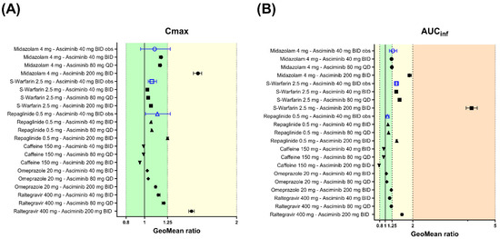 The geometric mean of the AUCinf and Cmax ratios of omeprazole (20 mg p.o., single dose on day 3), following oral administration of asciminib (40 mg BID, 80 mg QD and 200 mg BID for 5 days) in HVs, were predicted to be 1.04, 1.06, 1.22 and 1.03, 1.04, 1.12, respectively (Figure 8 and Supplementary Table S14). After oral co-administration of omeprazole 20 mg BID with asciminib (40 mg BID, 80 mg QD, or 200 mg BID), both starting at day 1 and for a total duration of 14 days, the predicted geometric mean AUC and Cmax ratios were 1.07, 1.06, 1.41 and 1.04, 1.04, 1.23, respectively (Figure 8 and Supplementary Table S14).