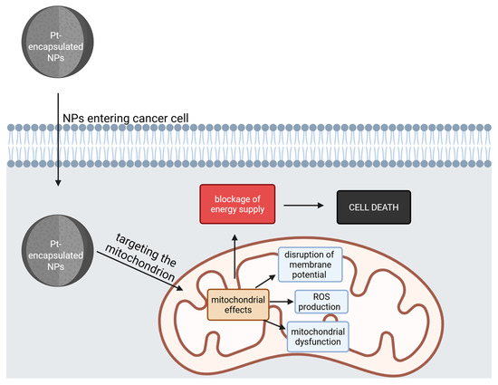 The general effects on mitochondria of Pt-encapsulated NPs. After entering the cancer cell, the NPs target and damage the mitochondria, leading to a blockage of energy supply, causing cell death (Created with BioRender https://biorender.com/0hj2h8q, accessed on 1 august 2025).