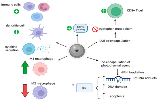 Mechanisms of NP-induced increased anti-tumoral immunity. These NPs activate immune cells, increase cytokine secretion, increase the M1/M2 macrophage ratio and can enhance ICD. (Created with BioRender https://BioRender.com/4ffd2r8, accessed on 1 august 2025).