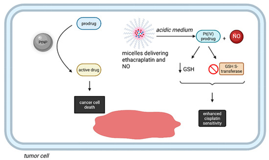 Pt complexes, in addition to their classical role as cytotoxics, were recently proved to perform bioorthogonal reactions in living organisms [76,77]. Even though some methods based on this approach do not directly employ Pt-based prodrugs, PtNPs serve as catalytic centers for a variety of reactions [76]. For instance, the synthesis of catalytic nanoreactors, represented by PEGylated Pt NPs with special properties, such as a dendritic structure and surface shielding by Pt-S-bonded PEG allow the compound to act within the complex intracellular microenvironment of cancer cells, thus enhancing the in situ biorthogonal activation of anticancer prodrugs [76]. Additionally, a combination between biorthogonal chemistry and an inhalation technique was employed to reverse cisplatin resistance in nonsmall cell lung carcinoma (NSCLC). The effect was achieved by co-delivery of ethacraplatin (i.e., a Pt(IV) prodrug) and nitric oxide (NO) by micelles, specifically targeting cancer cells after inhalation [77]. After arriving in the acidic tumor microenvironment, the Pt(IV) prodrug is released, inhibits GSH S-transferase and reduces the concentration of GSH, leading to increased sensitivity to cisplatin, with additional advantages associated with the release of NO (Figure 8) [77].
