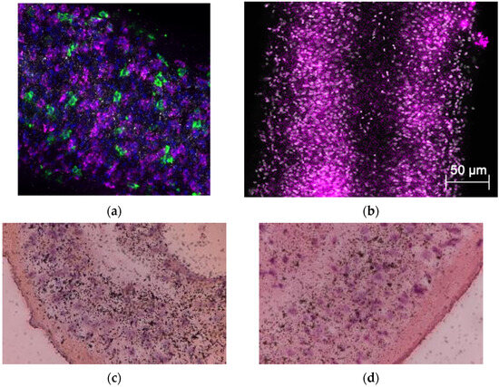 Figure 2. In situ localization of S. mansoni SULT and [3H] OXA localization. Freshly collected male worms of (a) S. mansoni and (b) S. haematobium. Body sections were fixed in 4% formaldehyde, dehydrated, and hybridized with riboprobe. A and B panels show that SULTs were produced by cells throughout the entire worm (blue is DAPI; green is stem cells (positive control); and magenta is S. mansoni SULT). [3H] OXA was incubated with adult male worms for 45 min, washed 3 times, and incubated for 14 days, with groups of 10 worms being removed and fixed in 4% paraformaldehyde every two days. Fixed worms were embedded in paraffin, sectioned, and subjected to autoradiography. Slides were lightly stained with H&E. The silver grains represent activated OXA bound to macromolecules either as an electrophile or neutrophile. The clustering is less prominent with longer time post-OXA exposure for (c) day 6 and (d) day 12 [89].