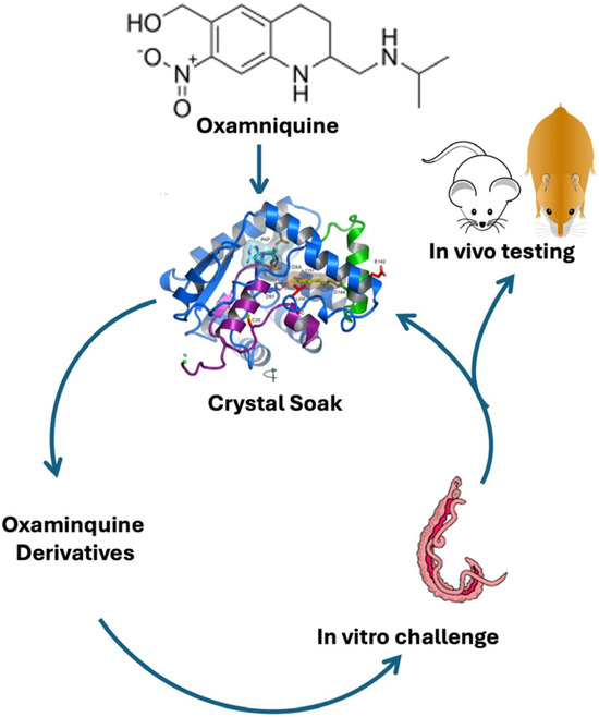 Guided by data from X-ray crystallographic studies and Schistosoma worm-killing assays on OXA, the structure-based drug design approach produced a robust SAR program that identified several new lead compounds with effective worm-killing abilities [70,86,92,93,95]. OXA was soaked into SULT crystals, and the structural relationships were determined to guide the synthesis of derivatives. The OXA derivatives were tested for cidal activity using worm motility assays or direct observation in cultured parasites. Derivatives that showed the best cidal activity were soaked into new crystals, and the process was repeated (Figure 3) [93,95]. Structures for S. mansoni SULT (SmSULT) and S. haematobium SULT (ShSULT) were used to design highly efficacious OXA derivatives that will kill the two major species of Schistosoma.