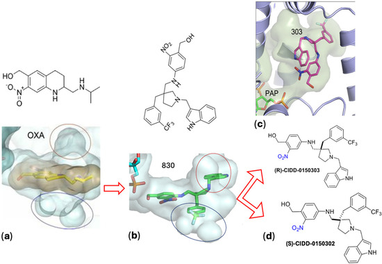 Figure 4. Evolution and identification of lead compounds. (a) The design strategy involved modifying OXA by removing the element of rigidity in the tetrahydroisoquinoline ring system, introducing two rotatable bonds, and adding a new substituted pyrrolidine ring to allow three-point SAR studies to optimize Sm SULT and Sh SULT residue interactions. The OH group in the upper left corner of the molecules is the site of sulfation, resulting in the formation of a reactive product that alkylates schistosome DNA and other macromolecules in sensitive parasites. This strategy resulted in the discovery of (b) CIDD-0149830, which was separated to provide (c) CIDD-0150303 and (d) CIDD-0150302. Images were generated using PyMOL (The PyMOL Molecular Graphics System, Version 3.0 Schrödinger, LLC, New York, NY, USA) [70,86,92].