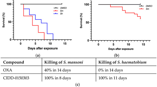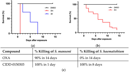 Figure 6. Kaplan–Meier curves demonstrating CIDD-0150303 and OXA lethality at 71.5 µM. CIDD-0150303 (a) and OXA (b) were tested against adult male worms in vitro (c) percentages of worm killing. Experiments and analyses were performed as described in Figure 5 [70].