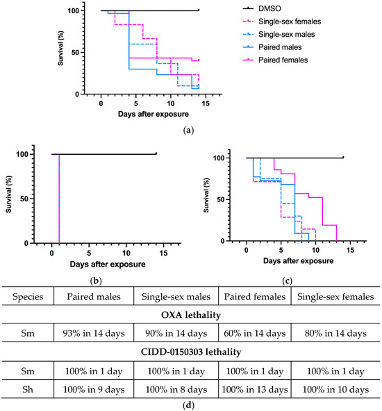 Figure 7. Kaplan–Meier curves demonstrating the ability of OXA and CIDD-0150303 to kill both genders. (a) OXA against both genders of S. mansoni. (b) CIDD-0150303 against both genders of S. mansoni. (c) CIDD-0150303 against both genders of S. haematobium. (d) percentages of worm killing. OXA and CIDD-0150303 were tested against 10 adults of a single sex—female and male worms and female and male worms in worm pairs per well. Both compounds were solubilized in 100% DMSO and administered at a final concentration of 143 μM per well for 45 min and washed 3X with media. The 45 min exposure mimics the exposure time in a human. All screens were performed in experimental and biological triplicates. Survival was plotted as a percentage over time using the prism/curve comparison/log-rank (Mantel–Cox) test. The p-value threshold for each derivative compared to DMSO was <0.00 [70].