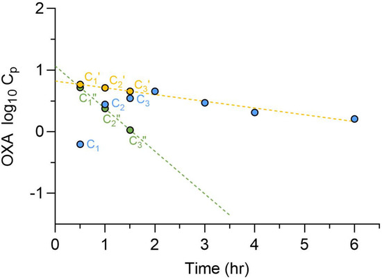 Figure 8. Determination of OXA oral absorption rate constants and portal concentration. Observed OXA plasma concentration-time profiles after a single 1000 mg oral dose in Sudanese patients (, C) were plotted on a semi-logarithmic scale, and the terminal phase was extrapolated to the Y-axis. Patient plasma concentration values (C) were subtracted from the corresponding concentration from the extrapolated terminal line (, C’, ---). The residual line was constructed by plotting the difference (, C”, ---) between the extrapolated and the observed concentrations for each timepoint in the absorption phase. The absorption rate constant was determined from the slope of the residual line. The calculated total hepatic inlet concentrations of OXA in patients was 94 µM [98].
