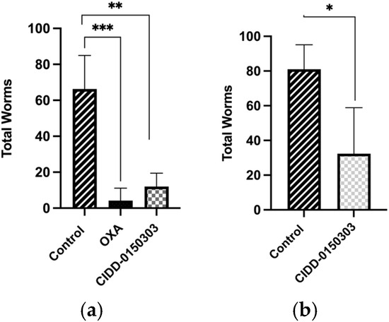 Figure 9. Effect of CIDD-0150303 on animals infected with (a) S. mansoni and (b) S. haematobium. Five mice per group were infected with S. mansoni, and five hamsters per group were infected with S. haematobium. Worms were collected 14 days after treatment with a single dose of 100 mg/kg by oral gavage and compared to the untreated control group. CIDD-0150303 reduced the worm numbers of S. mansoni to 81.9% (p = 0.0061) and S. haematobium to 71.2% (p = 0.0672) compared to the negative control (95% CI). Prism/unpaired t-test (p < 0.05). p < 0.05 (*), p < 0.01 (**), p < 0.001 (***) [70].