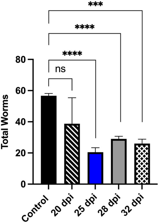 Figure 10. CIDD-0150303 significantly reduced the number of collected S. mansoni juvenile worms from infected mice. Five mice per group were infected with 80 cercaria of S. mansoni. Mice were treated with a single dose of 100 mg/kg by oral gavage of CIDD-0150303 on the day specified on the X-axis, and worm burden was determined at 45 dpi. Prism/unpaired t-test (p < 0.05). CIDD-0150303 reduced the worm burden significantly on 25 dpi by 64.8% (p = 0.0001), 28 dpi by 48.9% (p = 0.000), and 32 dpi by 54.1% (p = 0.0005) (95% CI). Prism/unpaired t-test (p < 0.05). p < 0.001 (***), p < 0.0001 (****). ns, not significant [70].