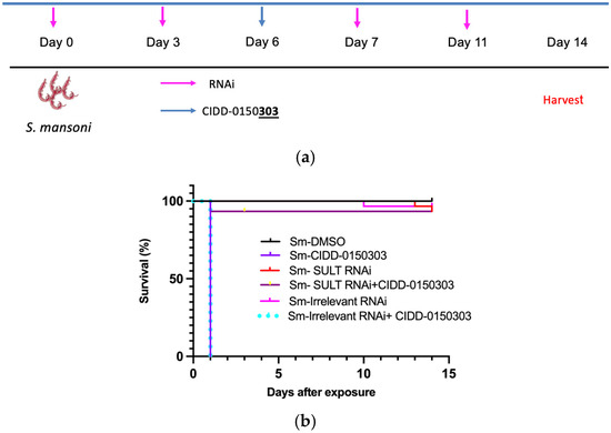 Figure 11. Kaplan–Meier curves demonstrating the (a) experiment schedule (b) knockdown of S. mansoni SULT confers resistance upon challenge. Adult male schistosome parasites, 10 per well, were treated with either Sm SULT dsRNA or dsRNA of an irrelevant gene at a final concentration of 30 µg/mL on days 0, 3, 7, and 11. The worms were treated with CIDD-0150303 for 45 min on day 6. The worms were observed for 14 days, pooled, and quick-frozen. The treatment groups were as follows: Sm SULT dsRNA alone, Sm SULT + CIDD-0150303, irrelevant gene control dsRNA, CIDD-0150303 alone, and DMSO solvent alone. All experiments were performed in 3 replicates. After 14 days, worm killing was observed in the presence of CIDD-0150303 with or without irrelevant gene control dsRNA. Sm SULT RNAi alone, irrelevant RNAi, and Sm SULT RNAi + CIDD-0150303 had 93%+ survival and displayed healthy characteristics. All other groups expressed similar, expected sensitivity levels to CIDD-0150303 treatments [70,89].