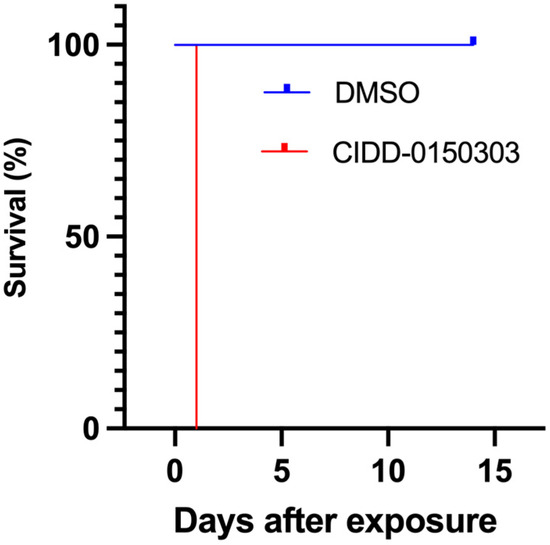 Figure 12. Kaplan–Meier curves demonstrating the ability of CIDD-0150303 to kill S. mansoni PZQ-R. Experiments and analyses were performed as described in Figure 5 [70].