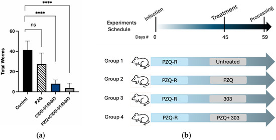 Figure 13. Combination therapy of PZQ and CIDD-0150303 against Sm PZQ-R parasite in vivo. (a) Combination therapy evaluation. (b) Experiment schedule. Five Balb/C mice per group were infected with 80 cercaria. Experimental groups were treated with 100 mg/kg of either OXA or PZQ orally for the single therapy and 100 mg/kg of both drugs for the combined therapy on 45 dpi orally. Mice were necropsied on 59 dpi. Worms were perfused from the portal and mesenteric veins with perfusion saline into Petri dishes and counted. Reductions and significance are represented relative to untreated control. PZQ + CIDD-0150303 reduced worm burden by 90.8% (p = 0.0001) (95% CI), and CIDD-0150303 alone reduced worm burden by 80.5% (p = 0.0001) (95% CI). Prism/unpaired t-test (p < 0.05). p < 0.0001 (****). ns, not significant [70].