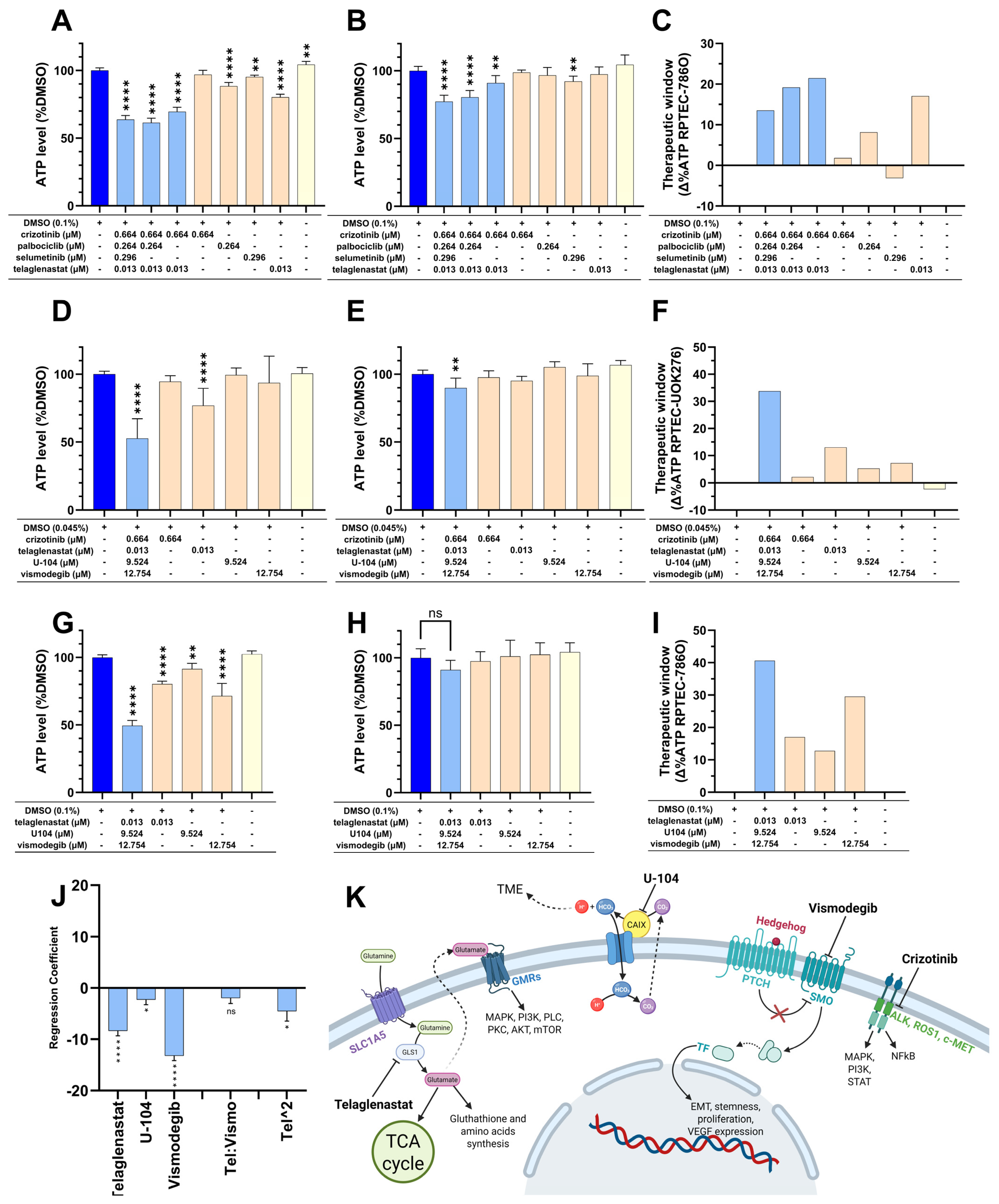 Figure 1. Selectivity of the ODCs. (A,B) ATP levels of (A) 786O cells or (B) RPTEC cells treated with variations of the four drugs present in the third search of the 786O-based screen. (C) TW of each condition tested in (A,B) calculated for each condition as the ATP levels of (A) subtracted from the ATP levels of (B,D,E) ATP levels of (D) UOK276 cells or (E) RPTEC cells treated with the four drugs, found in the third search of the UOK276-based screen, combined or as single agents. (F) TW of each condition tested in (D,E) calculated for each condition as the ATP levels of (D) subtracted from the ATP levels of (E,G,H) ATP level of (G) 786O cells or (H) RPTEC cells treated with three drugs of the additive combination found in the 786O-based screen, either combined or as single agents. (I) TW of each condition tested in (G,H) calculated for each condition as the ATP levels of (G) subtracted from the ATP levels of (H). (A,B,D,E,G,H) Significance was calculated between DMSO controls and all conditions using One-way ANOVA with Dunnett’s multiple comparison test. ns p > 0.05, * p < 0.05, ** p < 0.01, and **** p < 0.0001. (J) Regression coefficients estimated from a computational model based on experimental data from treated 786O cells. Histograms are separated by empty ticks into three parts representing (from left to right) 1st order single drug activity, drug–drug interactions, and 2nd order single drug activity. Error bars and stars correspond to the standard deviation and significance of the regression coefficients, respectively. Screening was performed as N = 3 independent experiments. (K) Schematic representation of the pathways targeted by the drugs composing the selected ODCs. Created with BioRender.