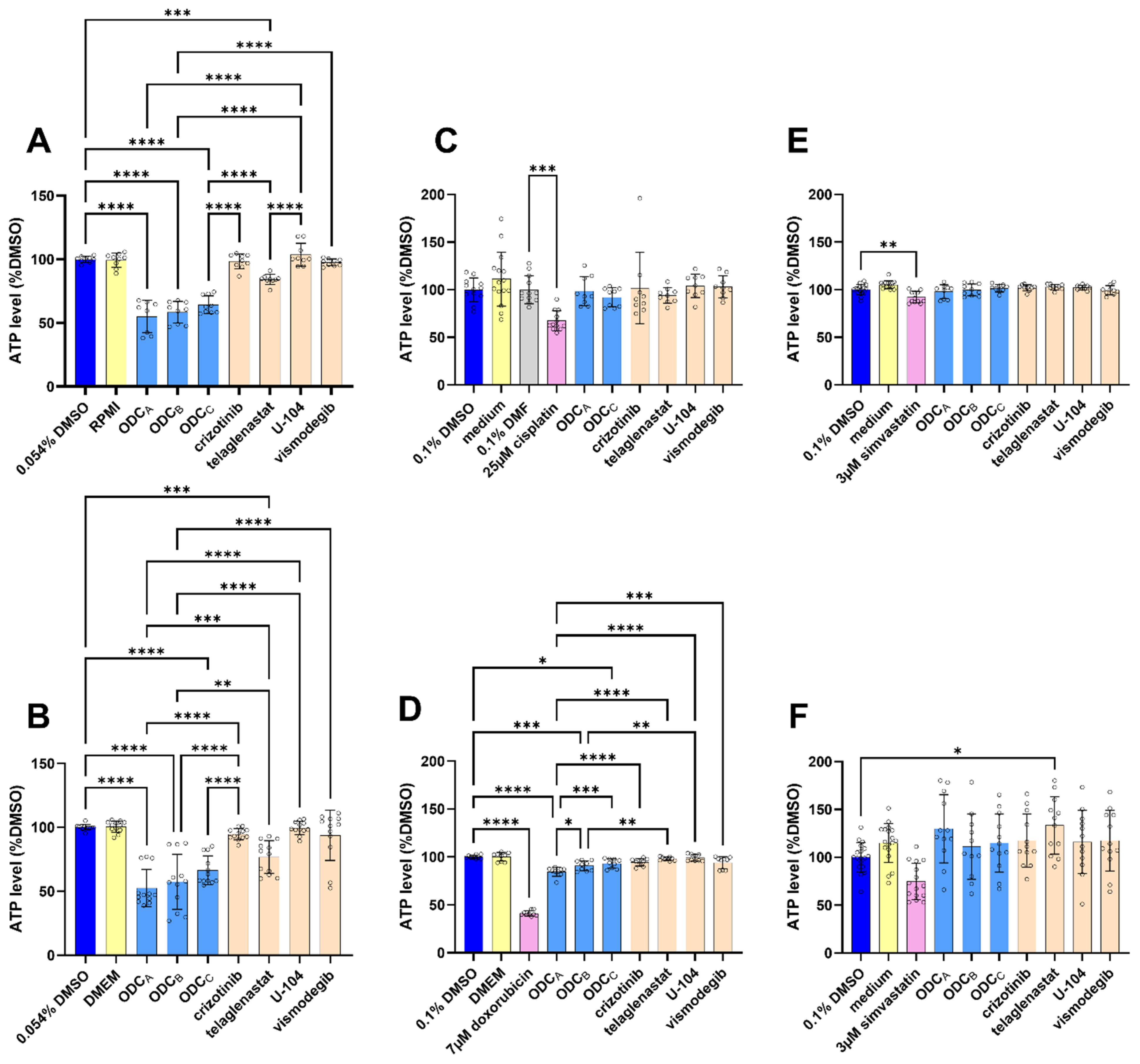 The cross-activity of our ODCs was first investigated. 786O and UOK276 cells were treated with all ODCs and monotherapies (Figure 2A,B). Despite different origins and mutation profiles, both cell lines reacted with similar ATP levels reduction to the different ODCs.