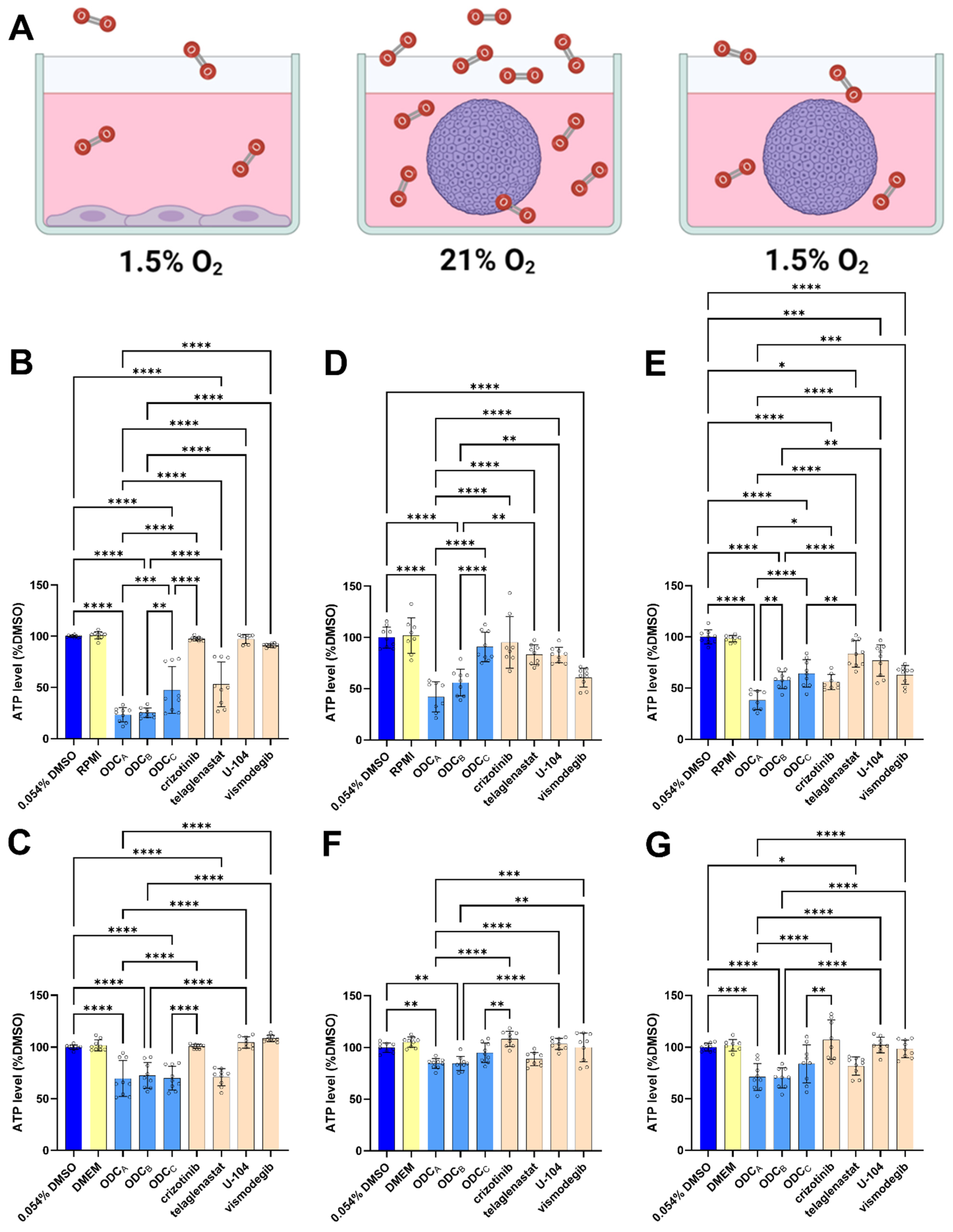 Figure 3. Effect of oxygen and culture dimension on ODCs’ activity. (A) Schematic drawing of the different culture/treatment conditions tested in (BG). Created with BioRender. (B,C) ATP levels of (B) 786O or (C) UOK276 cells cultivated as 2D monolayers in a 1.5% oxygen environment and exposed for 72 h to the ODCs (light blue) or their composing monotherapies (orange). (D,F) ATP levels of (D) 786O and (F) UOK276 spheroids cultivated in atmospheric normoxia and exposed for 72 h to the ODCs (light blue) or their composing monotherapies (orange). (E,G) ATP levels of (E) 786O and (G) UOK276 spheroids cultivated in a 1.5% oxygen environment and exposed for 72 h to the ODCs (light blue) or their composing monotherapies (orange). (BG) All data are shown as percentages of the 0.054% DMSO controls (dark blue). Culture medium control is presented as a yellow bar. Error bars indicate the standard deviation (metabolic activity measurement, N = 3) Circles highlight each technical replicate (n = 2–3). Significance was calculated using One-way ANOVA with Šídák’s multiple comparisons test and displayed as * p < 0.05, ** p < 0.01, *** p < 0.001, and **** p < 0.0001. Only comparisons to the DMSO controls, comparisons in-between ODCs, and comparisons between ODCs and their composing monotherapies were kept on the graphs. The absence of an asterisk between mentioned conditions means non-significant differences (p > 0.05).