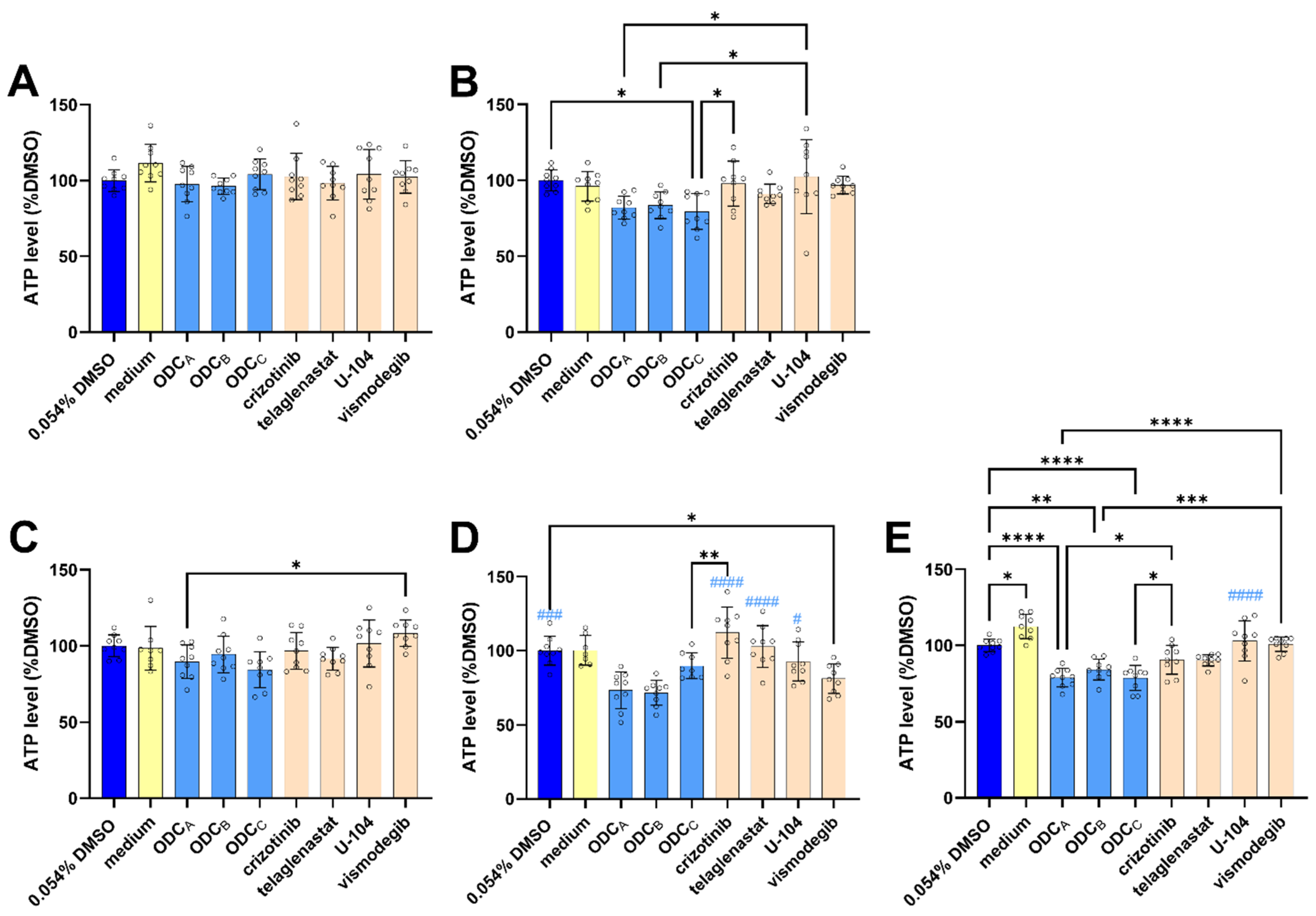 Figure 4. Effect of the ODCs on patient-derived 3D models. ATP levels of (A) PRCC1 cancer organoids, (B) PRCC20 cancer spheroids, (C) PRCC18 cancer spheroids, (D) PRCC9 cancer organoids, and (E) PRCC17_1 cancer spheroids. For all graphs: 0.054% DMSO control is presented in dark blue, medium control is displayed in yellow, various ODCs are shown in light blue, and monotherapies are presented in orange. Significance was calculated using ordinary one-way ANOVA with Tukey’s multiple comparison test from n = 2–3 technical replicas (displayed as circles in each treatment condition) in N = 3 independent experiments. Significance versus the 0.054% DMSO control, between ODCs, and between ODCs and their composing monotherapies is indicated with * p < 0.05, ** p < 0.01, *** p < 0.001, and **** p < 0.0001. Conditions that were significantly different from both ODCA and ODCB were labeled with blue hashtags indicating significance as follows: # p < 0.05, ### p < 0.001, and #### p < 0.0001.