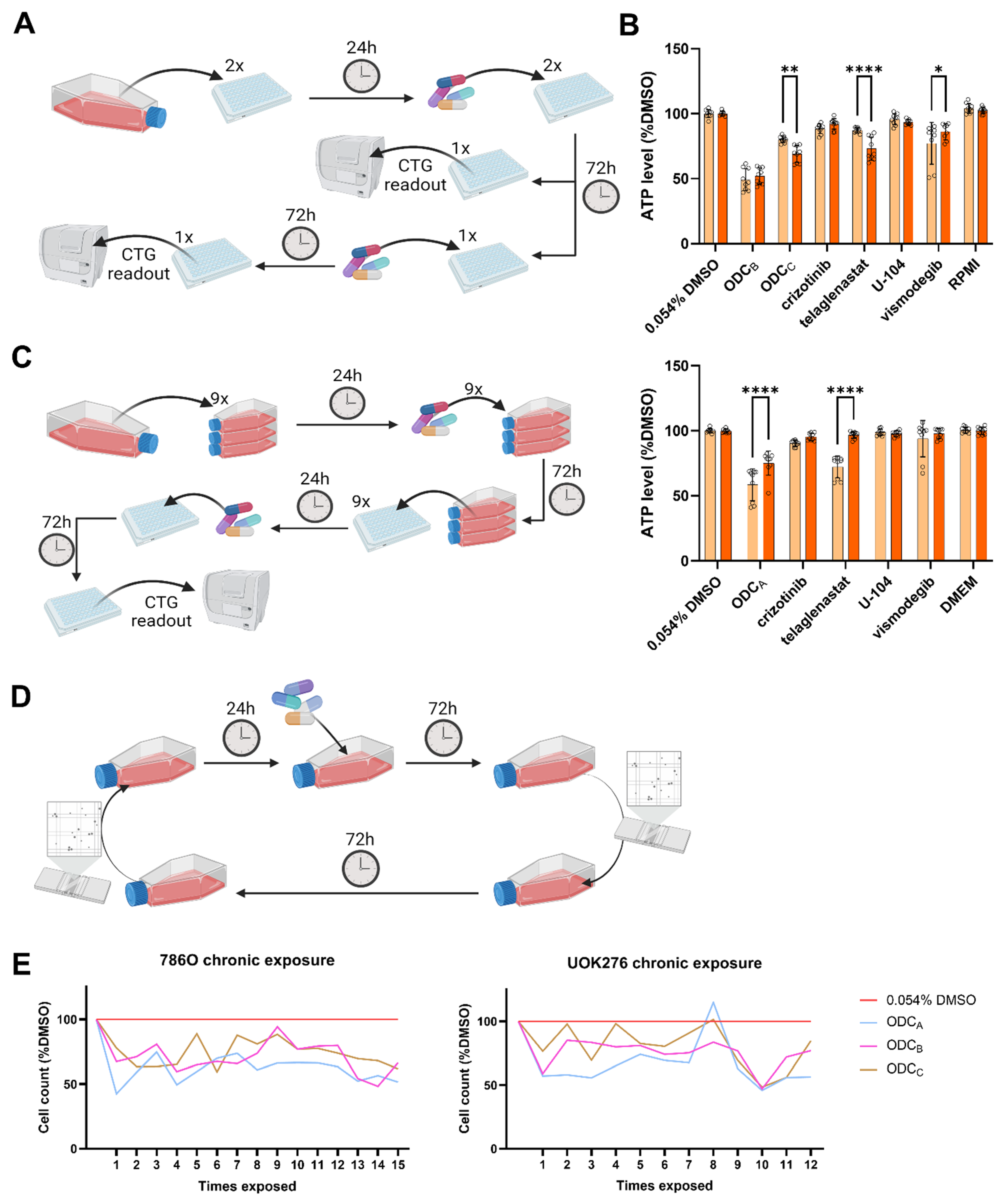 Figure 5. Effect of repeated exposure on treatment response. (A,C,D) Schematic representation of the different re-treatment strategies adopted for retreatment of (A) the same plate, (C) the same cell population, and (D) of the same cell population for a long period. (B) Response to first (orange) and second (red) treatment in 786O (top) and UOK276 (bottom) following the method described in (A). Each cell line was treated only with the ODC(s) and corresponding monotherapies identified in that same cell line. Both graphs are the results of N = 3 independent experiments including n = 3 technical replicate for each condition. (C) Data generated following this protocol can be found in Supplementary Figures S14 and S15. (E) Results of the retreatment with ODC conducted as indicated in (D) on 786O (left) and UOK276 (right) cells. Each point in the graphs corresponds to the mean of three measurement from N = 1 independent experiment. Color code can be found in the legend (far right) and is valid for both cell lines. Graduation on the x-axis corresponds to the number of times the cells were exposed to the drugs for 72 h. Circles highlight each technical replicate (n = 3). Significance was calculated using Two-way ANOVA with Šídák’s multiple comparisons test and displayed as * p < 0.05, ** p < 0.01, and **** p < 0.0001.