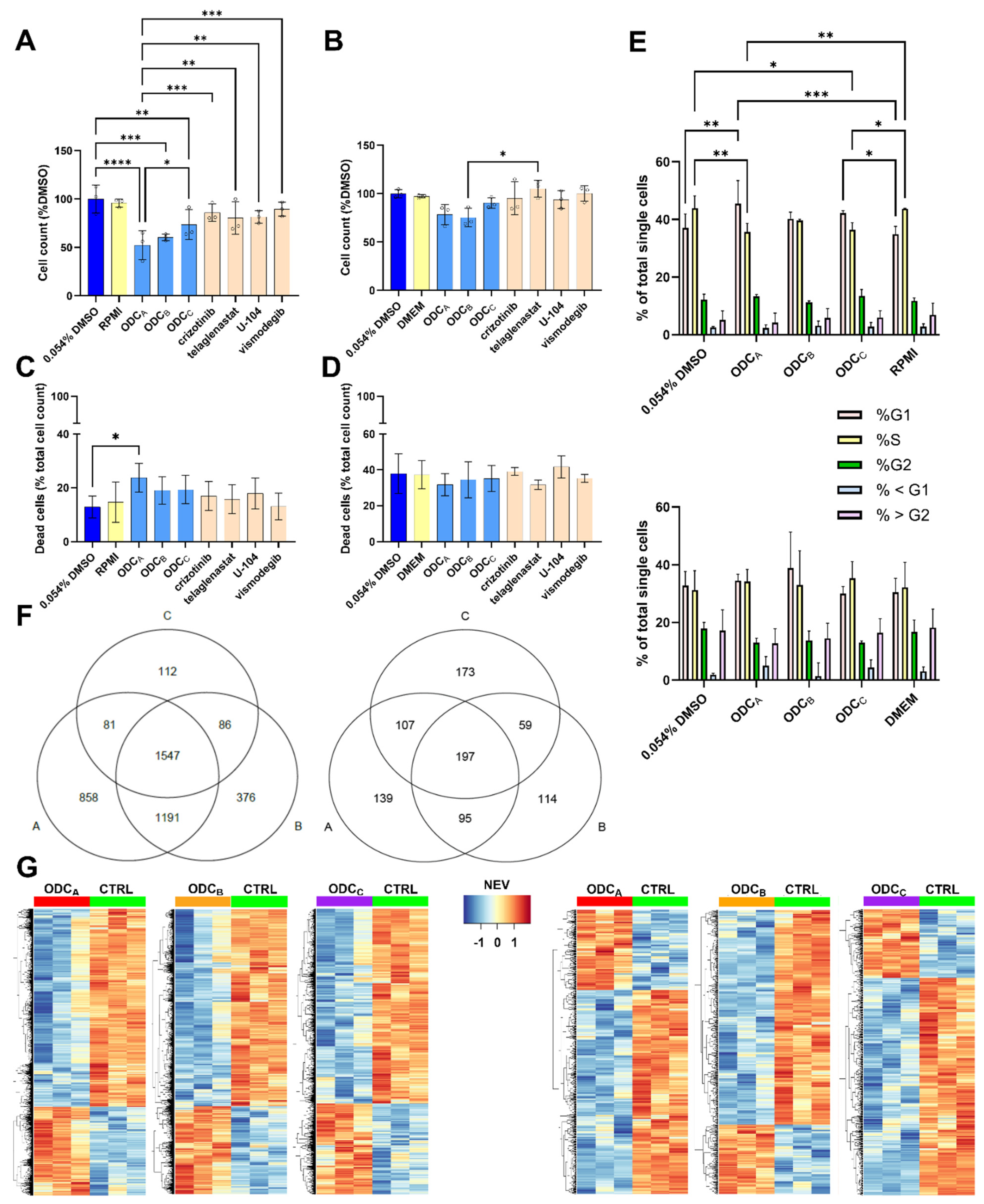 Figure 6. Insight into the mechanism of the ODCs. Percentage of counted living cells in treated (A) 786O and (B) UOK276 cells compared to the count in the 0.054% DMSO control. (C,D) Percentage of dead cells compared to the total cell count in each treated condition for (C) 786O-treated flasks and (D) UOK276-treated flasks. (AD) Error bars indicate the standard deviation (cell count measurement of N = 3 independent experiments). Circles highlight each technical replicate (n = 1). Significance was calculated using Two-way ANOVA with Tukey’s multiple comparisons test and displayed as * p < 0.05, ** p < 0.01, *** p < 0.001, and **** p < 0.0001. (E) Cell cycle distribution of 786O (top) and UOK276 (bottom) cells exposed for 24 h to the ODCs or controls. The cell cycle phases color code in both graphs is as indicated in the legend (middle). Significance was calculated between similar cell cycle phases of all conditions using Two-way ANOVA with Tukey’s multiple comparisons test and displayed as * p < 0.05, ** p < 0.01, and *** p < 0.001. Examples of the gating can be found in Supplementary Figure S17. (F) Venn diagram of genes significantly affected by ODCA (A), ODCB (B), and/or ODCC (C) in 786O (left) and UOK276 (right) cells. (G) Heatmaps of up- (red) and down- (blue) regulated genes in 786O (left) and UOK276 (right) cells after 72 h of treatment with the ODCs. “NEV” (center) stands for Normalized Expression Values. (F,G) Only the genes that are significantly different (p < 0.05) and have a fold change superior to or equal to 2 compared to the 0.054% DMSO control are displayed.