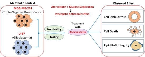Combined Effects of Atorvastatin and Glucose Deprivation on Metabolic Stress and Lipid-Raft Disruption in Glioblastoma and Breast Cancer Cells
