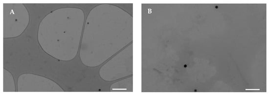 TEM micrographs of Se NPs prepared in water (A) or in ethanol/water mixture (B) (white line–scale bar: 500 nm).