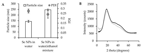 Particle size and PDI (A) of Se NPs prepared in water or in ethanol/water mixture, mean values ± s.d.; n = 3. One-way ANOVA; Scheffé test (p ≤ 0.05), particle size: Se NPs in water vs. Se NPs in water/ethanol mixture. XRPD spectra (B) of Se NPs prepared in water (black line) or in ethanol/water mixture (gray line).