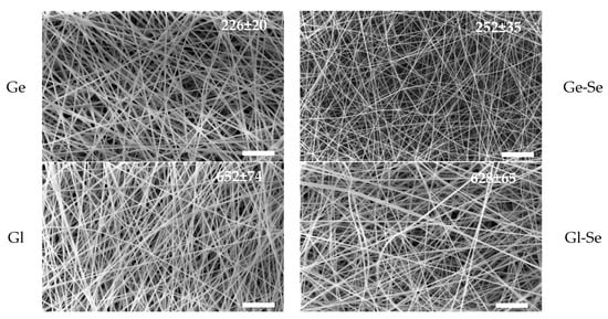 SEM micrographs of scaffolds: Ge, Ge-Se, Gl, Gl-Se (while line–scale bar: 10 μm). In the insets, the mean diameters of fibers (nm) are reported (mean values ± s.d., n = 30).