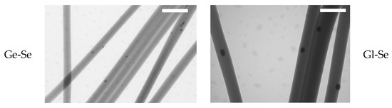 The presence and distribution of selenium nanoparticles within the polymer matrix were investigated using TEM (Jeol JEM-1200 EX II, Tokyo, Japan), performed on fibers that were directly electrospun onto copper grids.