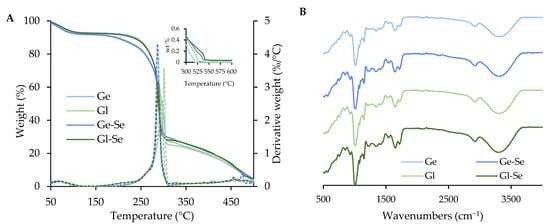 The thermogravimetric analysis of the electrospun fibers (Ge, Ge-Se, Gl, Gl-Se) is reported in Figure 5A. The thermograms reveal three stages of degradation. The first weight loss of approximately 10% occurs between 40 °C and 110 °C and is related to the evaporation of adsorbed and bound water (peak temperature: 75–85 °C). The second stage represents the main degradation event, which begins around 160–170 °C and peaks at about 300 °C (peak temperature: 285–300 °C). During this stage, the scaffolds lose about 75% of their mass due to the thermal decomposition of the organic matrix, resulting from cleavage of peptide bonds, degradation of side chains, and the release of volatile low molecular weight fragments. The third stage, starting at around 300 °C and extending up to 520–550 °C (peak temperature: 450–475 °C), involves the degradation of more stable carbonaceous residues. This phase leads to the complete decomposition of organic matter in the undoped scaffolds. However, in the Se NP-doped scaffolds (Ge-Se and Gl-Se), a residual mass of about 0.04% can be appreciated and persists beyond 550 °C. As this residue is not present in the undoped samples, it can be attributed to the inorganic selenium component, and this value corresponds to the theoretical selenium content.