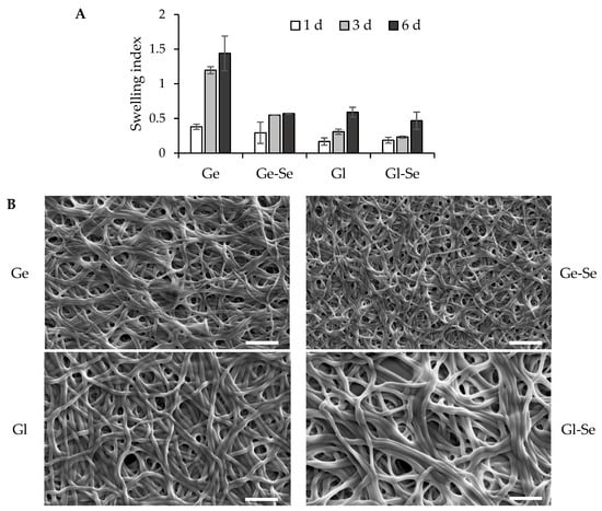 Swelling properties of electrospun scaffolds (A) expressed as swelling index (mean values ± s.d.; n = 5). One-way ANOVA; Scheffé test (p ≤ 0.05): Ge 3 d vs. Ge-Se 3 d, Gl 3 d, and Gl-Se 3 d; Ge 6 d vs. Ge-Se 6 d, Gl 6 d, and Gl-Se 6 d. SEM images (B) of electrospun scaffolds after 6 days of hydration (white line–scale bar: 5 µm).