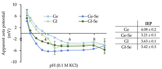 Moreover, the doping with Se NPs leads to a slight decrease in the IEP for both protein-based scaffolds, more markedly in the case of Gl-Se (from 4.08 to 3.21), suggesting that Se NPs interact with positively charged groups of the proteins.