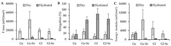 Mechanical properties: (A) force at break (mN/mm2); (B) elongation (%); (C) Young’s modulus (mN/mm2) (mean ± s.d.; n = 3). One-way ANOVA; Scheffé test (p ≤ 0.05): Elongation: Ge hydrated vs. Ge-Se hydrated, Gl hydrated, and Gl-Se hydrated; Young’s modulus: Ge dry vs. Ge-Se dry; Ge hydrated vs. Ge-Se hydrated, Gl hydrated, and Gl-Se hydrated.
